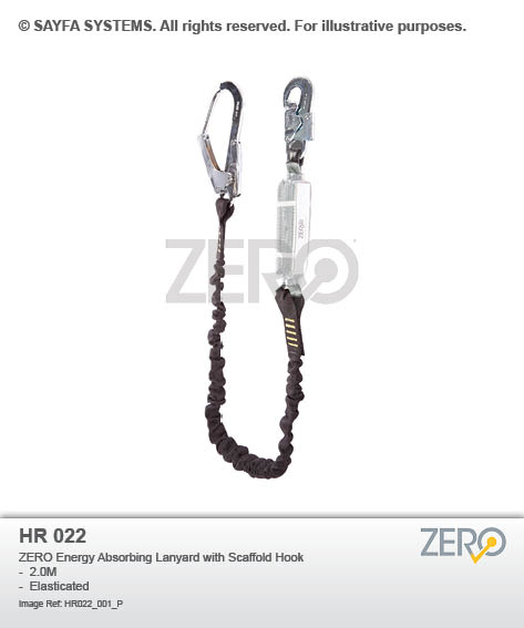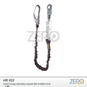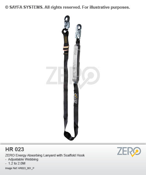 Description: ZERO Energy Absorbing Lanyard with Scaffold Hook – Adjustable Webbing – 1.2 to 2.0M