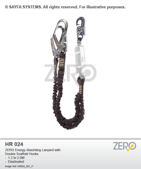 Description: ZERO Energy Absorbing Lanyard with Double Scaffold Hooks – 2.0M – Elasticated