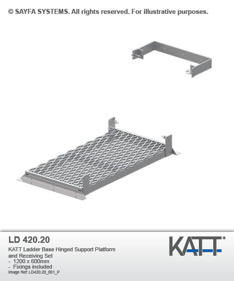 Description: KATT Ladder Base Hinged Support Platform and Receiving Bracket – 1200 x 600mm – Fixings included
