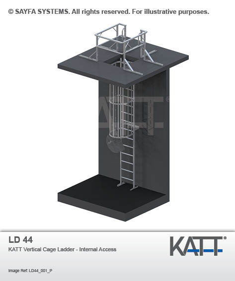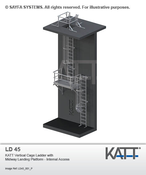 Description: KATT Vertical Cage Ladder with Midway Landing Platform – Internal Access