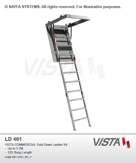 Description: VISTA COMMERCIAL Fold-Down Ladder Kit – Up to 3.2M Note: To suit suspended ceiling installations Weight: 40.0kg