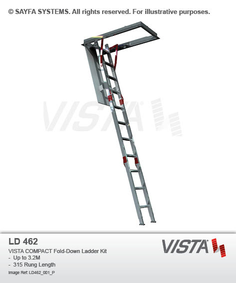 Description: VISTA COMPACT Fold-Down Ladder Kit – Up to 3.2M Note: To suit timber truss installations Weight: 32.0kg