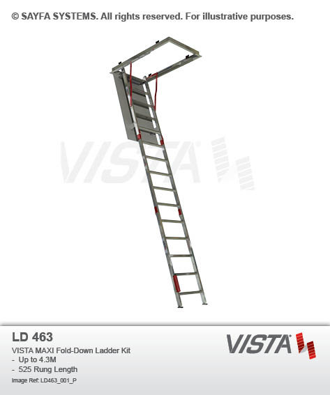 Description: VISTA MAXI Fold Down Ladder Kit – Up to 4.3M Note: To suit extra high suspended ceilings Weight: 50.0kg