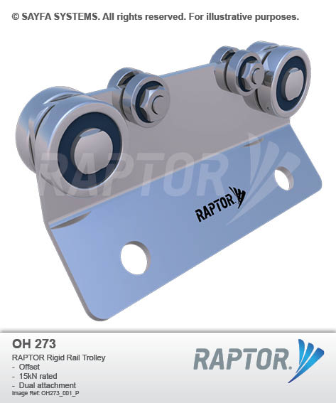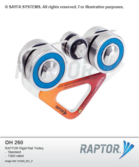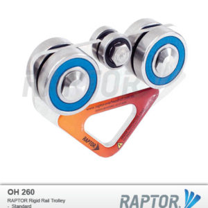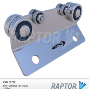 Description: RAPTOR Rigid Rail Trolley – Offset – 15kN rated Note: For wall and floor mount applications Weight: 2.6kg