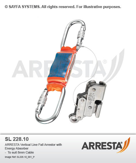 Description: ARRESTA Vertical Line Fall Arrestor with Energy Absorber – To suit 8mm Cable Weight: 0.9kg