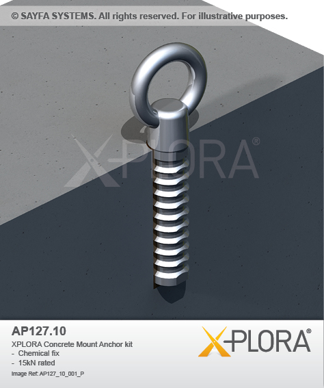Description: XPLORA Concrete Mount Anchor kit – Chemical fix – 15kN Note: ! Suitable for fall arrest/twin rope use, must be load tested as per AS/NZS Standards Weight: 0.5kg