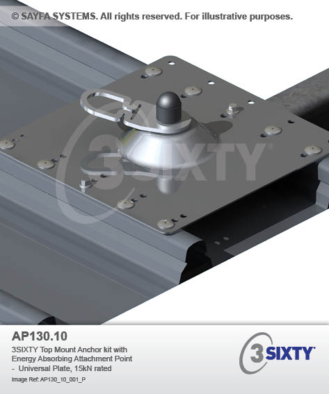 Description: 3 SIXTY Top Mount Anchor Kit with Energy Absorbing Attachment Point – Universal Plate, 15kN rated Note: ! Not suitable for twin rope access use Weight: 1.4kg